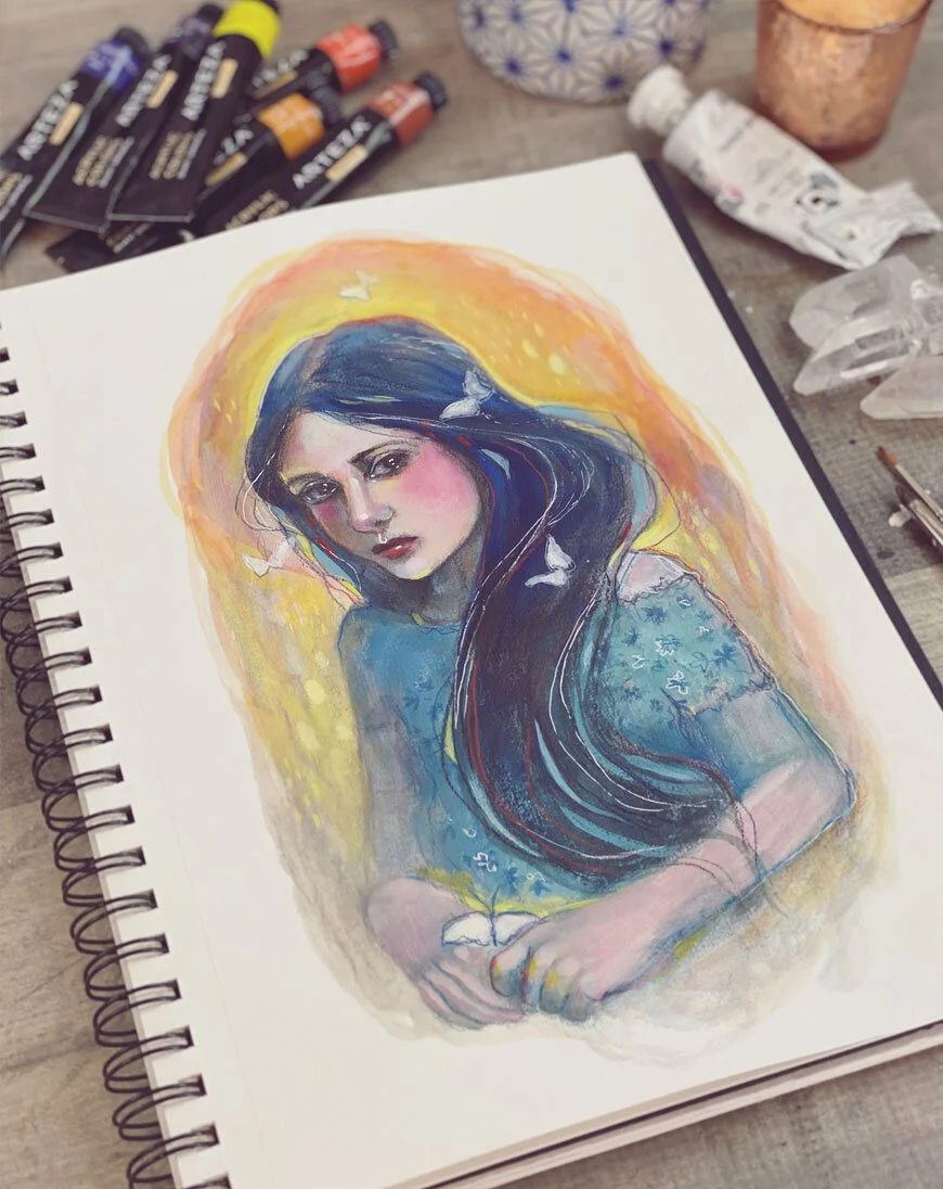 Have fun exploring this palette and your connection to these colors! Play freely with both the color and your linework and mark making. Really feel into this work. Focus on what you are trying to express with your portrait and then follow that feeling with your brush work, colors and marks.
