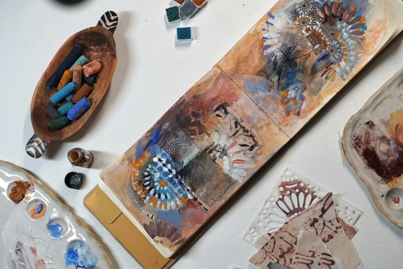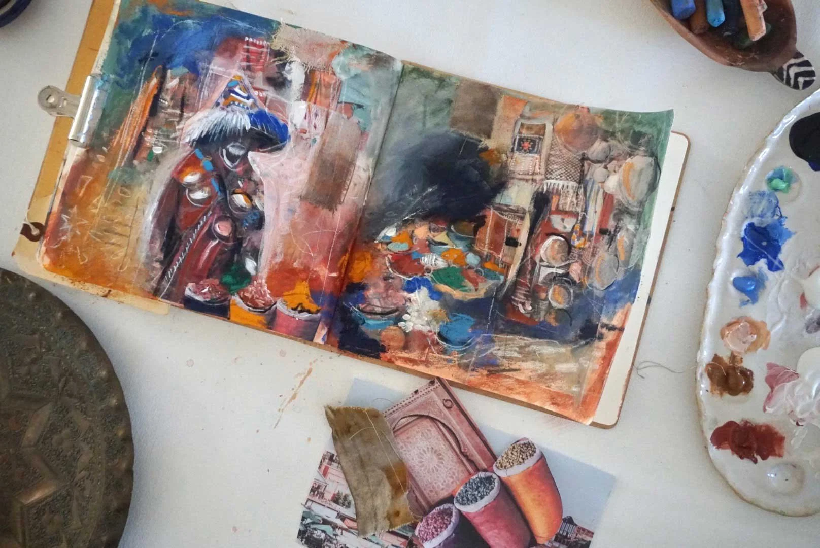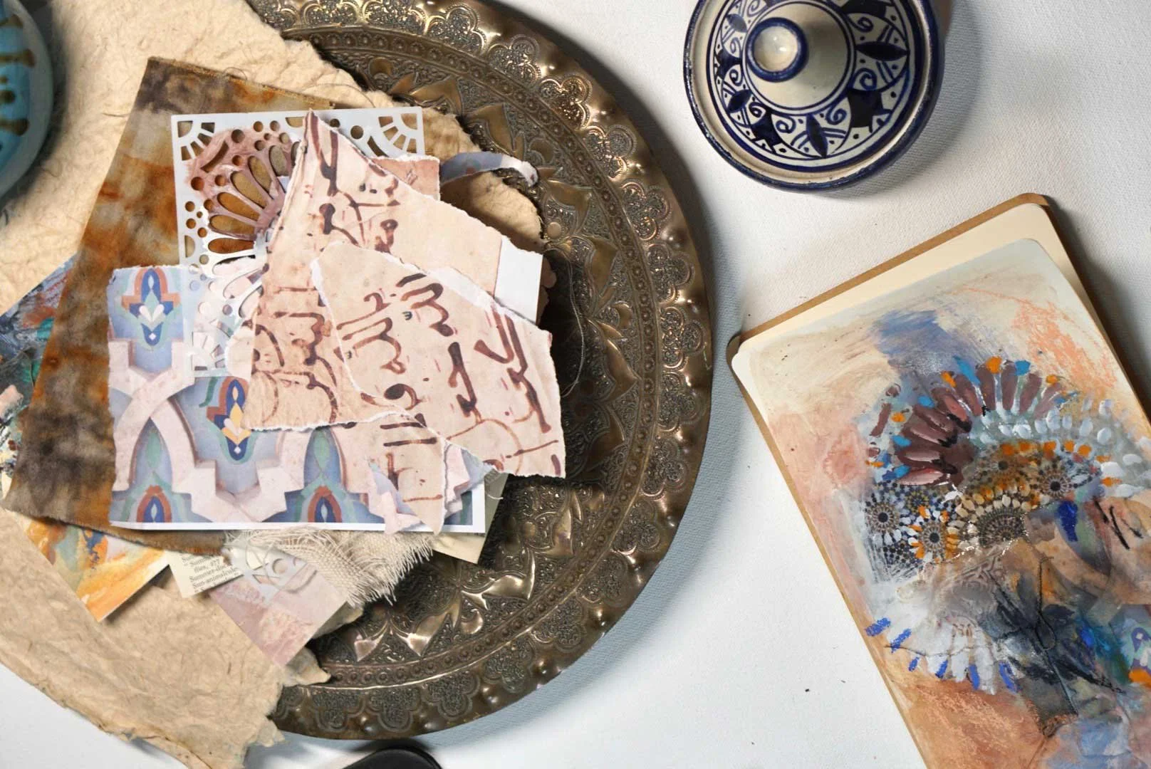 We will start by collecting elements to inspire our work and create a color palette inspired by different aspects of the culture. We will apply what we have gathered to our art journals to help us better connect to the country and to our selected palette. At this stage, my hope is that you experiment and find hues that resonate with you. Combining mixed media elements, collage, marks, stencils, and a variety of mediums we will connect to Morocco in a warm-up journal exercise.