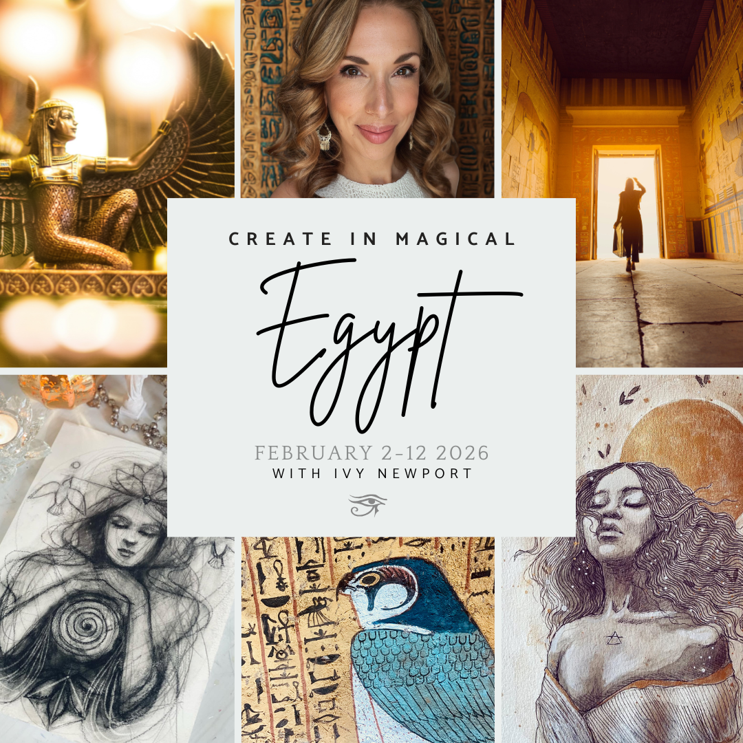 We’ll explore goddess altar cards with collage and mixed media, goddess portrait studies, and symbology sketchbook pages inspired by ancient Egyptian motifs, on-location sketching and painting and more…
