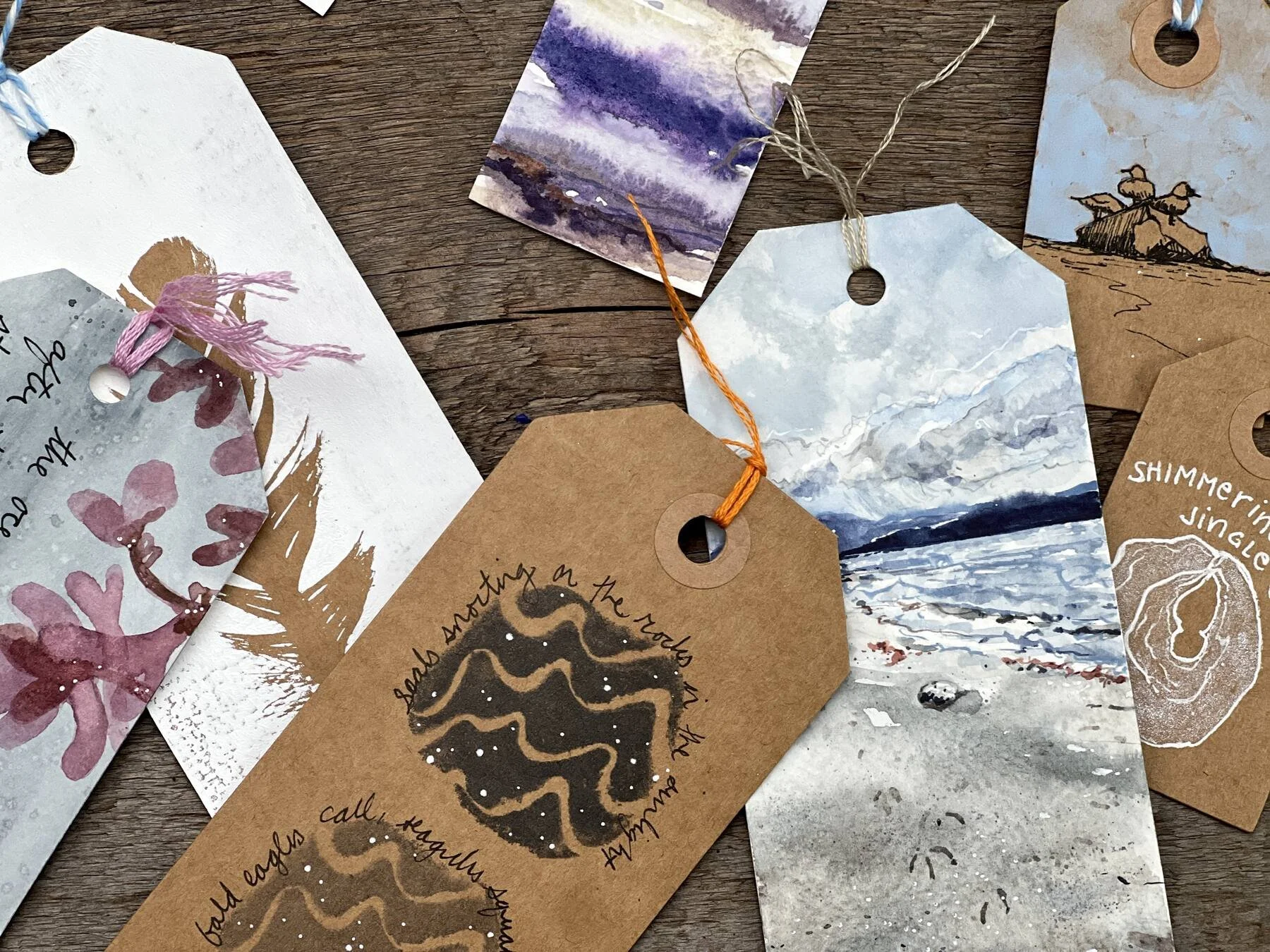 After you’ve created a collection of small artworks, you’ll curate and arrange them into one piece. Your tags will be displayed on a canvas, hung with miniature clothes pegs, creating a visual record of your time and place. You can think of each tiny artwork as one sentence in the story of your landscape, and together they represent your whole experience.