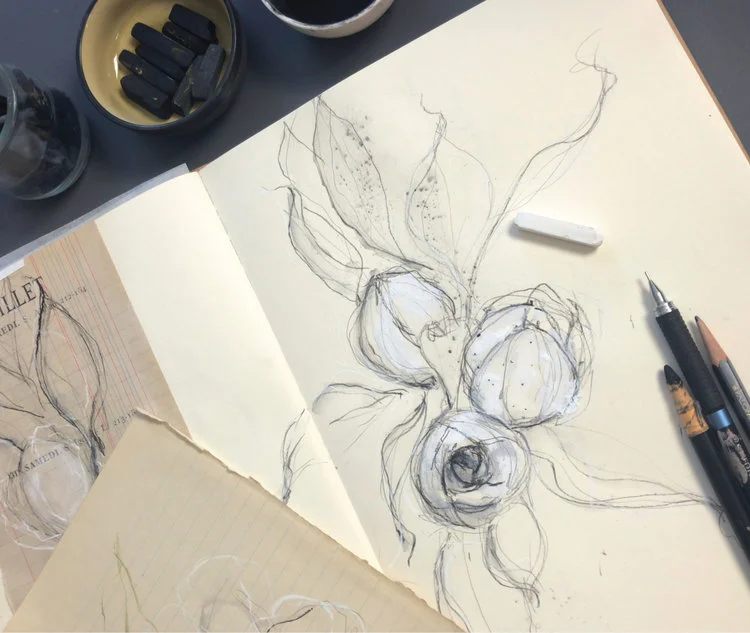 In this first project we are going to create a “Library of Flowers” in our art journals using a few simple tools like graphite, charcoal and water. You will love how these loose and expressive flowers float across the page.