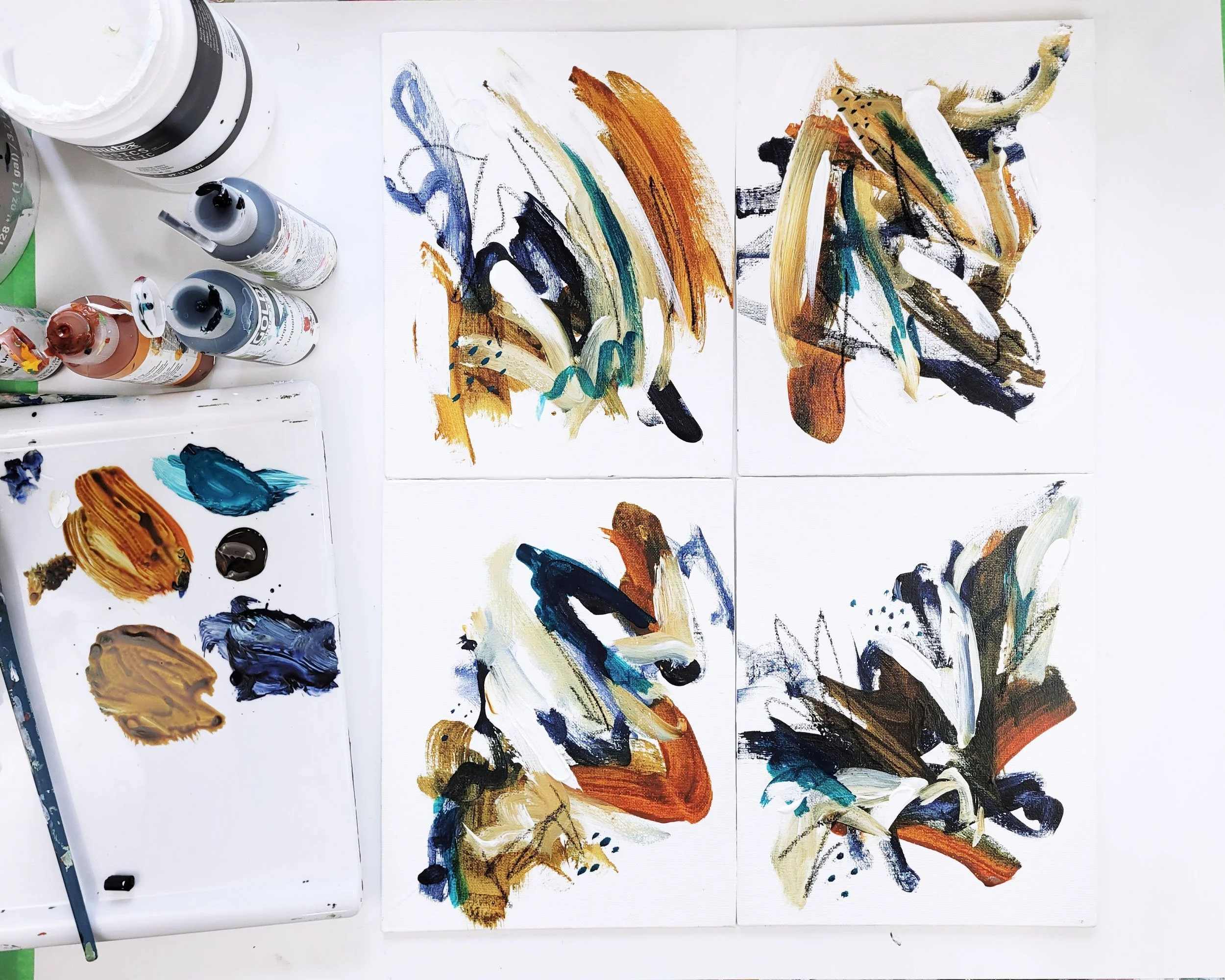 In Lesson 1 we will paint 6 small canvas boards simultaneously using the colour mixes and marks we discovered in the Warmup to create quick small abstracts. Painting multiple pieces at once might sound intimidating but it’s really fun! The goal is to gain confidence in mark making and to see how simplicity is sometimes key to creating abstracts with impact. When finished these small pieces can be easily popped into frames and hung together or alone!