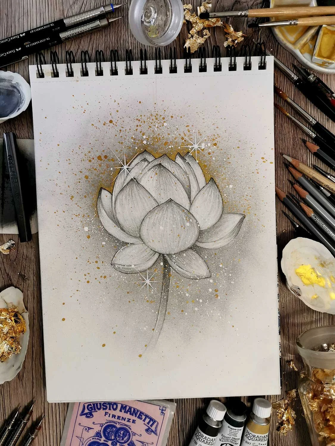 To round off gently and come full circle with our alchemical artwork, we free-hand draw a soft and embracing lotus flower. Lotus is a beautiful symbol of beauty emerging from the depths of mud, and so, shares symbolistic meaning with the process of alchemy, the making of gold from lesser substances.