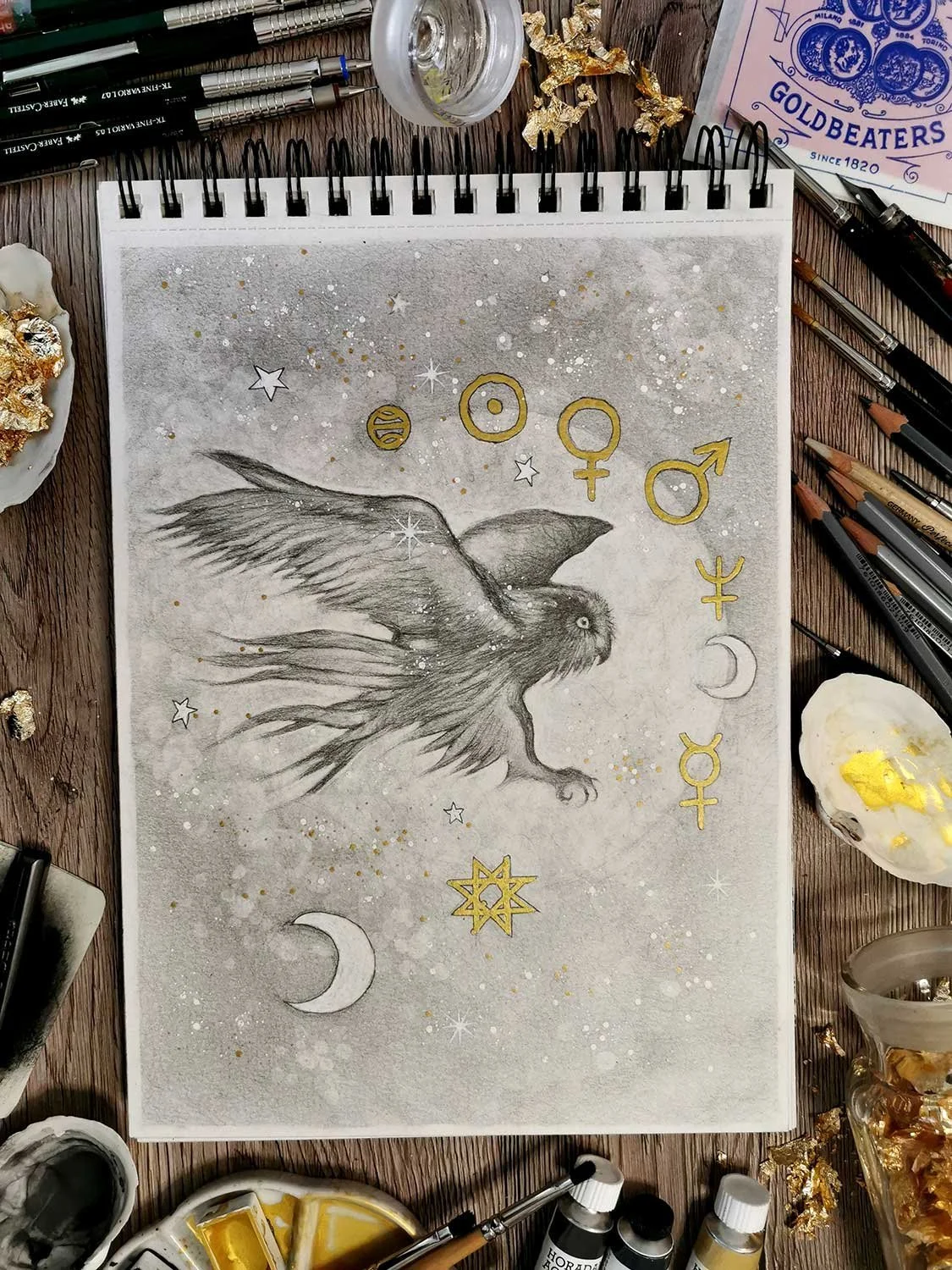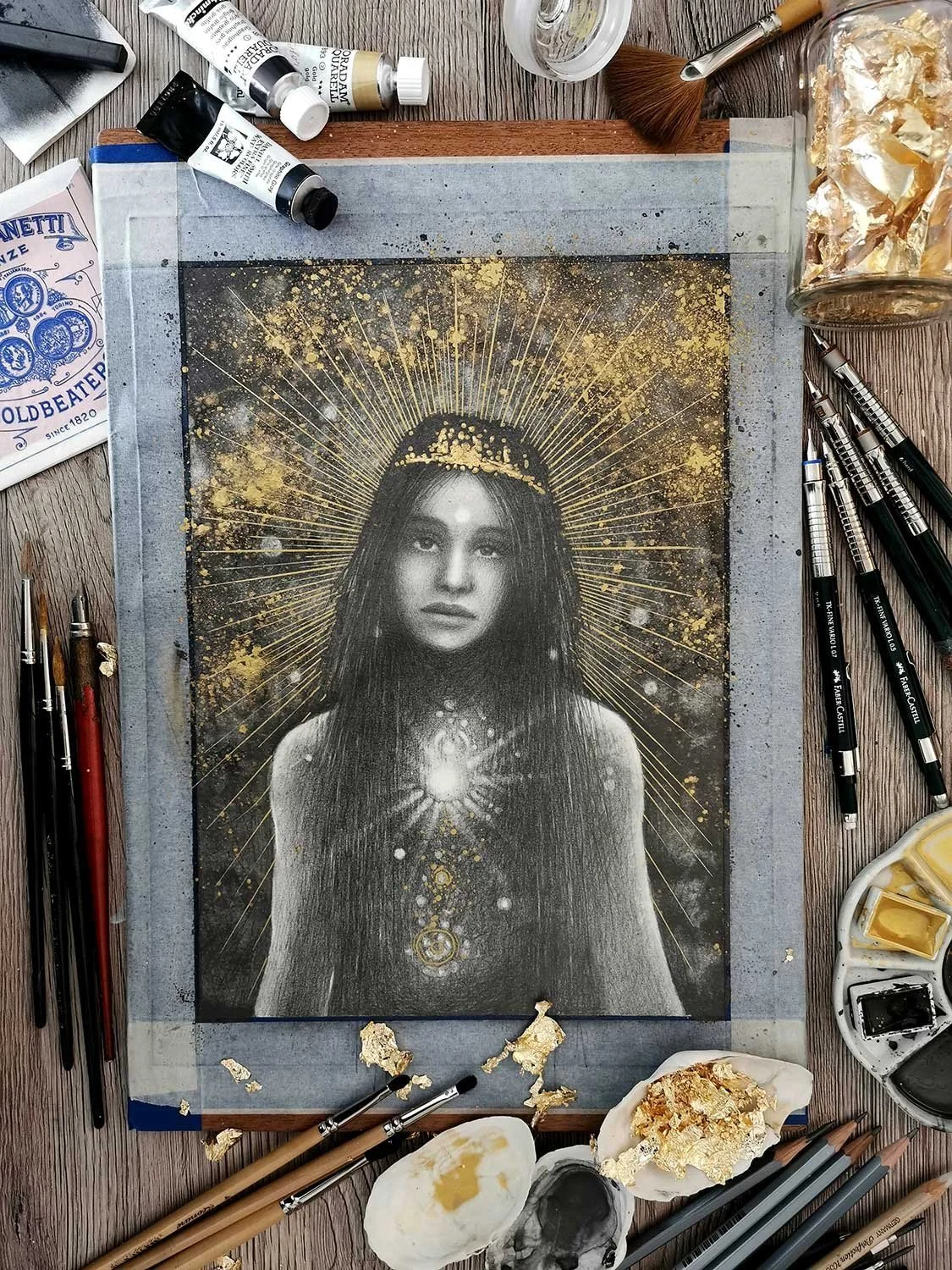 I have always been deeply fascinated with the art of alchemy - the symbolic process of transforming lesser substances into pure gold. Graphite in hand, I will take you on a journey, exploring alchemy through deep and archetypical symbology and symbols, like chakras, mandalas, spirit animals and the divine feminine. On this journey, I will teach you my best practices for making magic with gold and graphite.