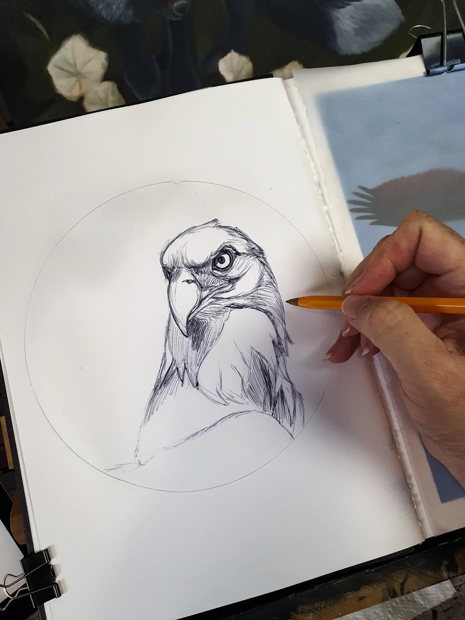 In this lesson, we are going to closely observe our reference of a bald eagle, and capture their likeness using ball point pen! This lesson is the basis for our next lesson, where we will paint over this sketch. Sketching under a painting like this is a fantastic opportunity to really get to know your subject, to be evaluating and learning from their form in a monochromatic way before attempting to introduce colour, and builds our drawing skills. Using ball point pen takes away some of the perfectionism that can come from using a medium like graphite, that can be easily erased.