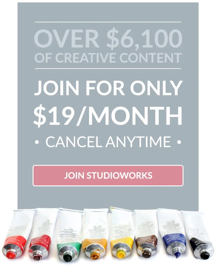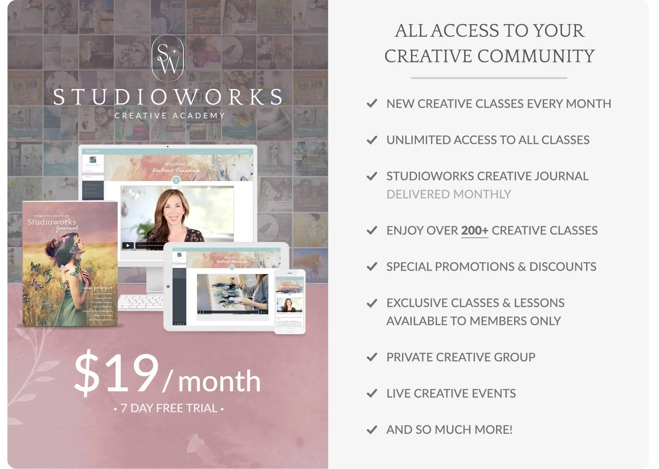 Buying online art classes adds up right? Plus buying all those supplies! Well, with the Studioworks membership you get to enjoy it ALL 200+ classes for one monthly price!