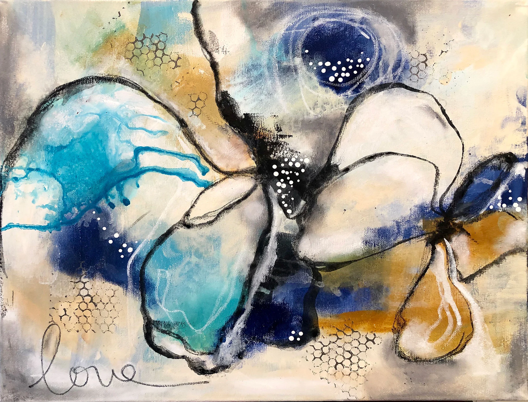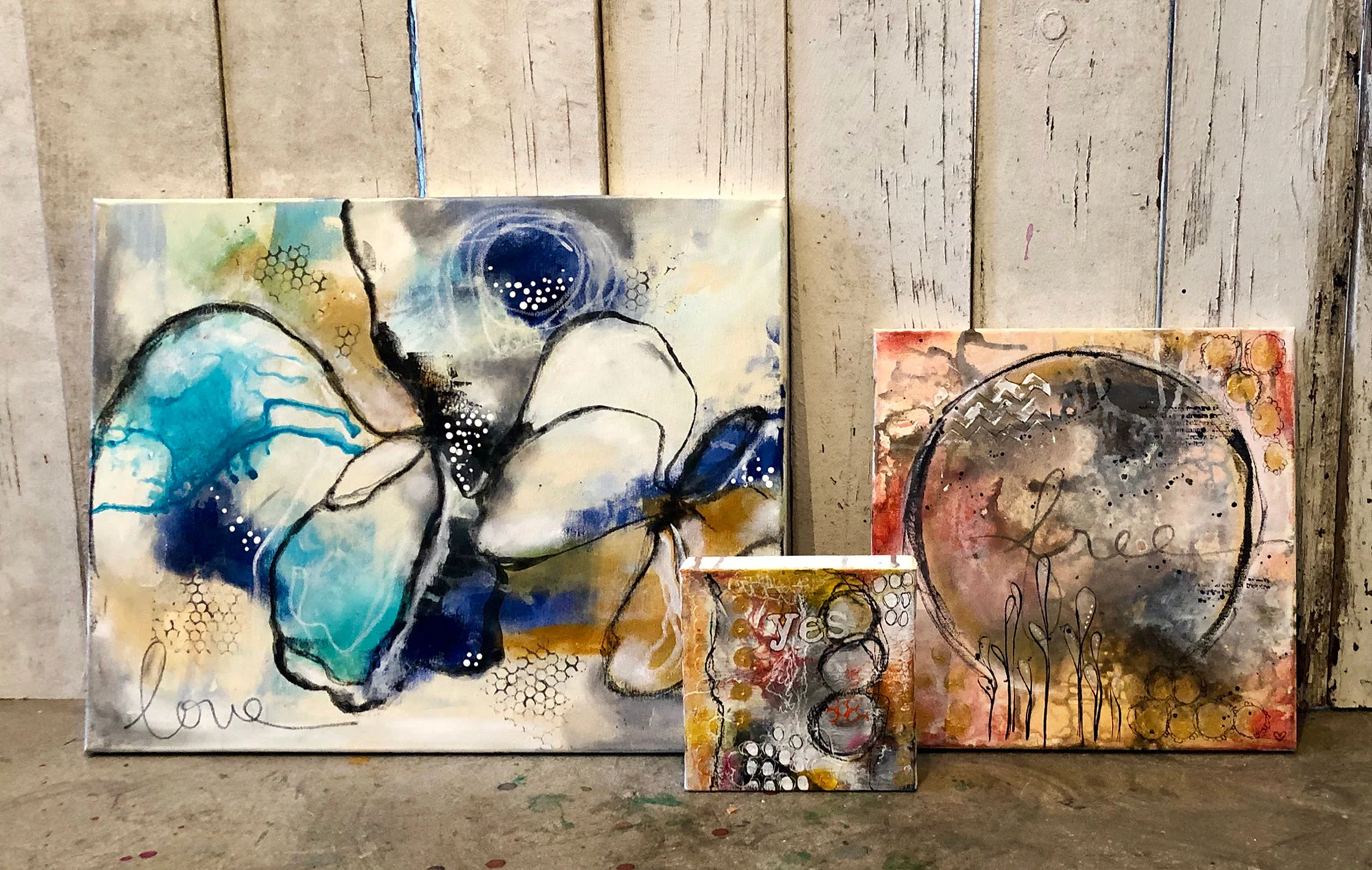 Now that you’re warmed up, we’re going to create on the fly using some specific techniques. I love splashing and dripping paint. This lesson will utilize all of the mediums we’ve explored thus far…and take it up a notch. Together we’ll continue moving through this divine process. And…do you like adding words or phrases into your art? Here’s your chance! Smile! Play looks good on you!